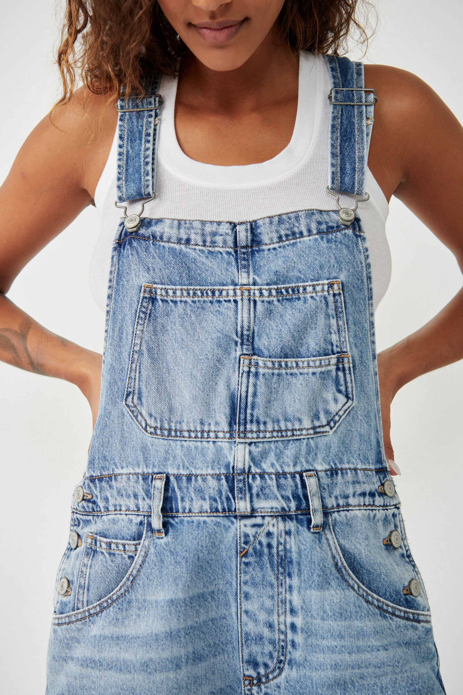 Features: Front bib pocket, rolled hemlines, adjustable straps, side button closures, five-pocket design, frayed cuffs