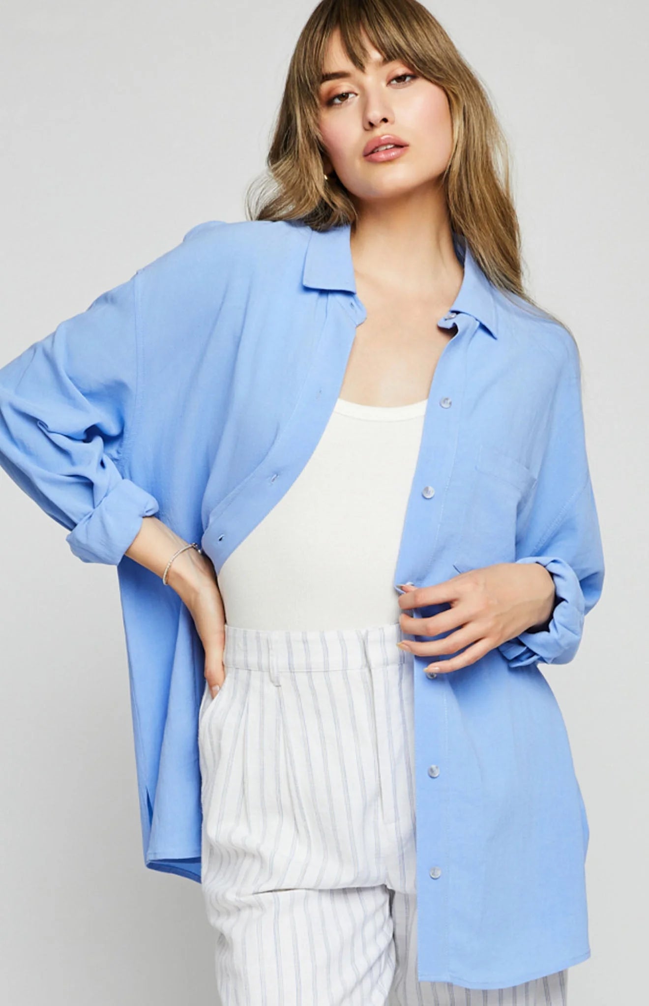 The Hudson button-down shirt is made of a lightweight linen blend that layers perfectly. Wear it as is or worn open for an effortless look.