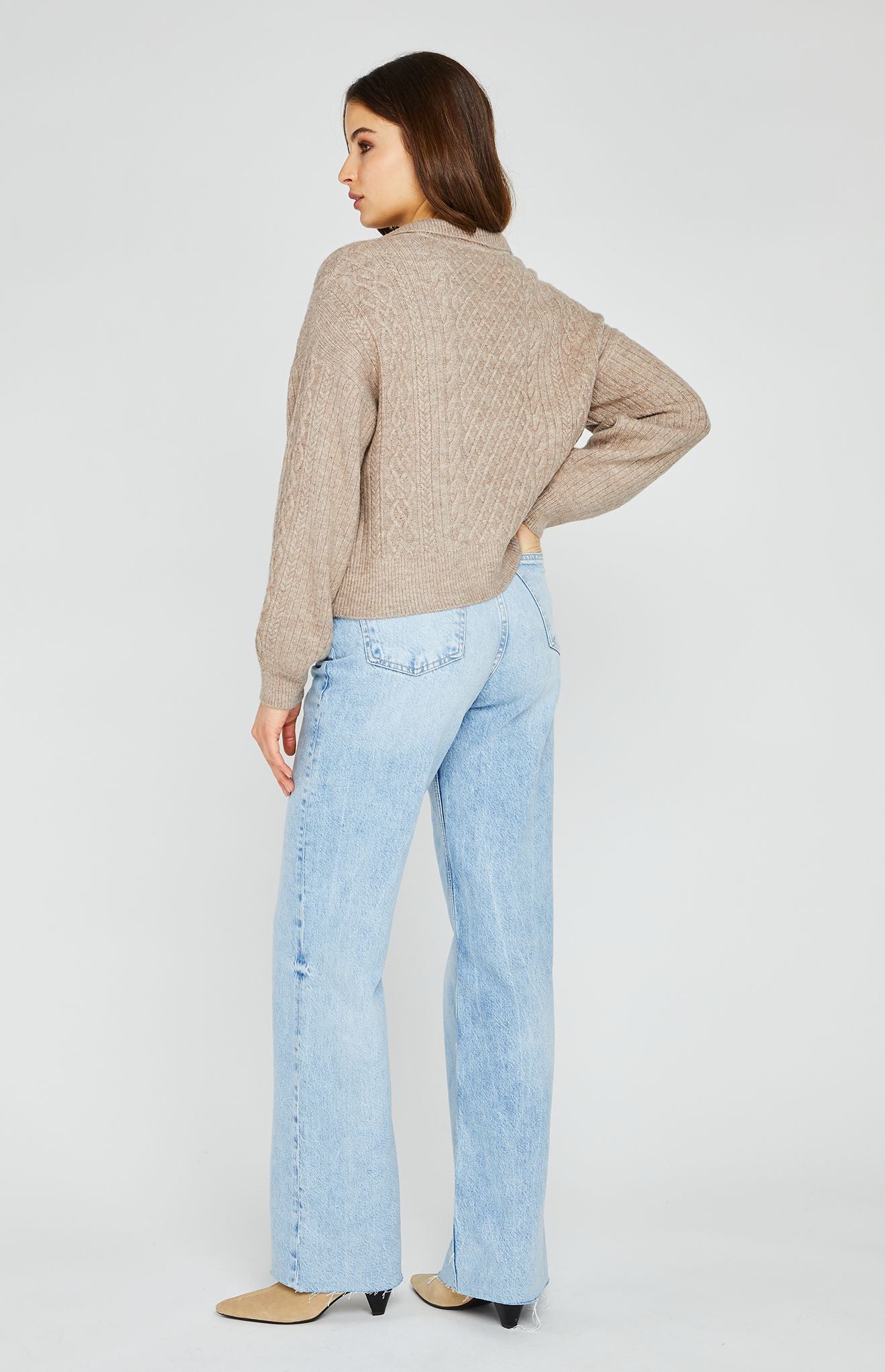 The Gentle Fawn Napa sweater is made of a soft and cozy yarn. Features include a collar with a half placket and cable knit stitch details throughout.