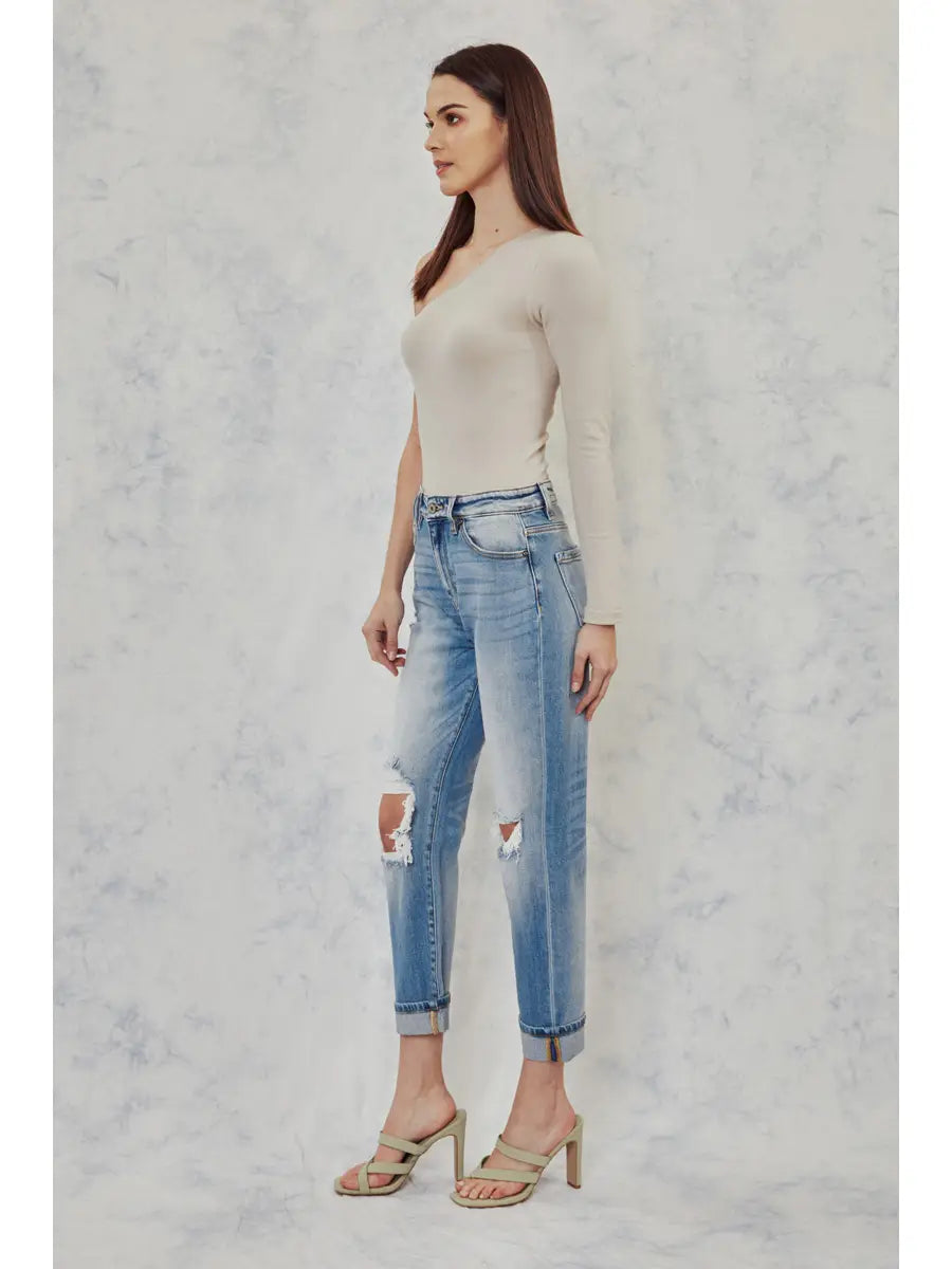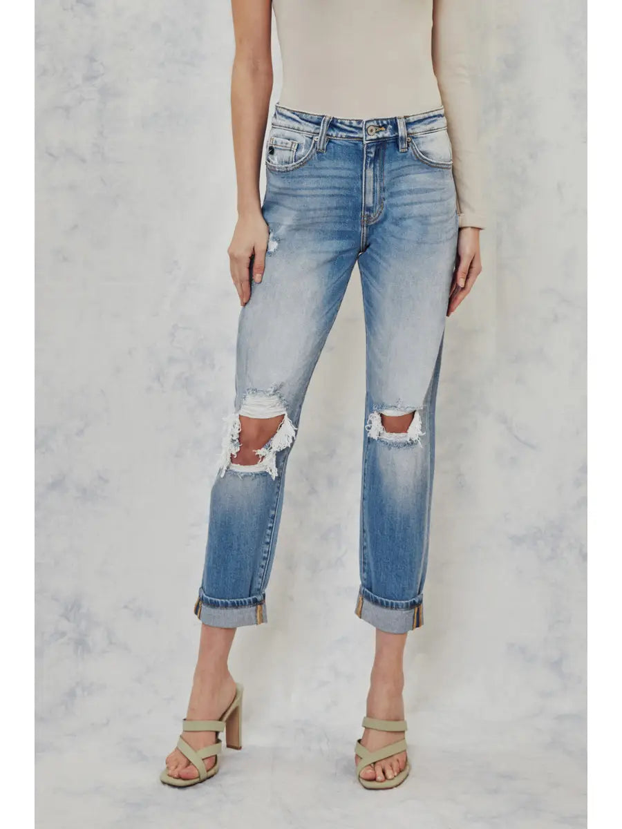 Refresh availabilityThe Milan High Rise Jeans come in an ultra-relaxed mom fit that gives you just the right amount of casual and chic. Sits above the natural waistline as it drapes over the legs for an easy and comfortable look. Made with stretch denim with a heavily faded wash, open-knee destruction, and a folded hem creating an extra lived-in style that's flexible and holds its shape. Features a classic five-pocket design, single-button front, and zip-fly closure.